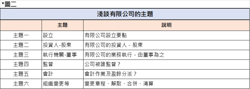 「主題一-設立」,由於有限公司適合情況常為:股東人數少,甚至僅一人,且股東間經常彼此熟識(可能案例,見圖三說明)。承前敘述,有限公司展現的重要特質為「以人為本、閉鎖性」,例如「以人為本」在股東決議方式是數人頭(非按出資額比例)、「閉鎖性」在股東之股份移轉須經其他股東同意(非自由移轉)。