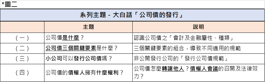 公司債發行系列分為四個主題,本文為主題三,為讀者再次彙整主題,以利見樹見林的方式閱讀本系列,見下圖二: