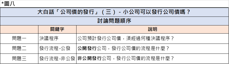 在系列之三,我們想知道:自有的小規模公司可發行公司債嗎?。答案是「可以」,公司法在第246條~第265條已對公司債清楚規範。再將議題延伸,實務上應探討—公司債容易發行嗎?讓我們從理解公司債的發行流程,研判難易程度。本所在此提出三個常見問題,見下圖八: