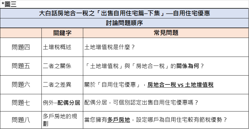 誠真事務所延續上集之議題,在本文則著重「關於自用住宅優惠,房地合一稅與土地增值稅的差異在哪裡?」,並提出「夫妻分居卻未辦理離婚,如何使用自用住宅優惠」及「同時擁有多戶房地,自用住宅應該設定在哪戶」,我們將常見問題列示在下圖三:
