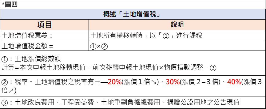 - 土地增值稅,即以「土地漲價總數額」為課稅標的,其概述見下圖四之說明: