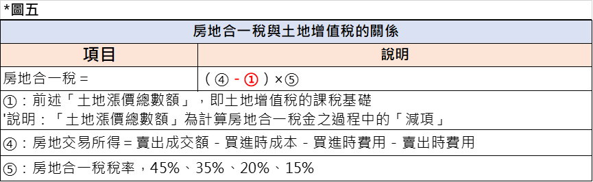 - 房地合一稅與土地增值稅的關係為何,我們以下圖五說明: