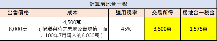 - 成本降低,而大幅課稅所得:原購入成本6,000萬(100年7月),卻在113年8月出售時降低至4,500萬(因為贈與行為),因此提高房地合一課稅所得1,500萬(6,000萬-4,500萬),換算稅金高達675萬。