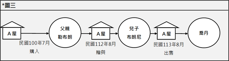 - 父親勒布朗在民國100年7月以6,000萬購入坐落台北市A屋,並於112年8月贈與兒子布朗尼,其房地公告現值4,500萬。布朗尼因愛好賭博而資金周轉失靈,於113年8月以8,000萬出售A屋予喬丹。以下圖三理解之: