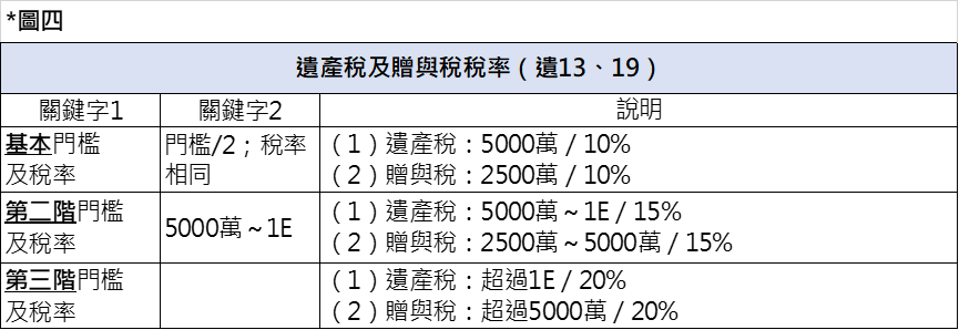 - 遺產及贈與稅—課稅級距及稅率(見下圖四)