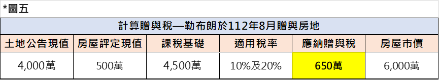 - 計算勒布朗在112年8月因贈與需繳納之贈與稅:稅金650萬。(計算見下圖五)