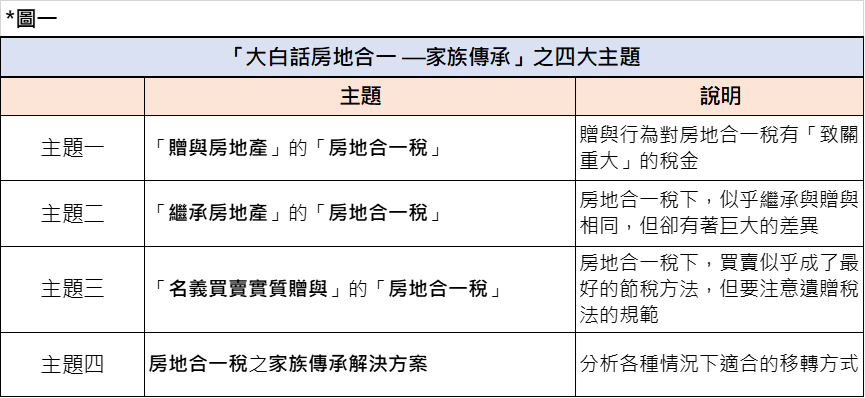本系列主題專注在「家族中不動產所有權之移轉規劃」,誠真事務所詳細分析三種常見的移轉方式(1繼承、2移轉、3名義買賣實質贈與)對最終稅負的影響,不同方式將造成南轅北轍的稅金,稍有不慎則巨額稅金降臨。複習家族傳承計畫的四個議題:見圖一