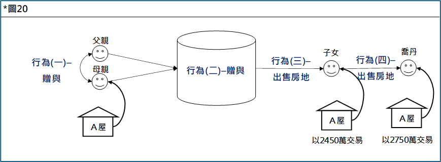 - 誠真事務所將上述案例拆解為四個行為(下圖20之行為(一)~行為(四)),逐一分析「名義買賣,實質贈與」會遇到的稅賦風險。