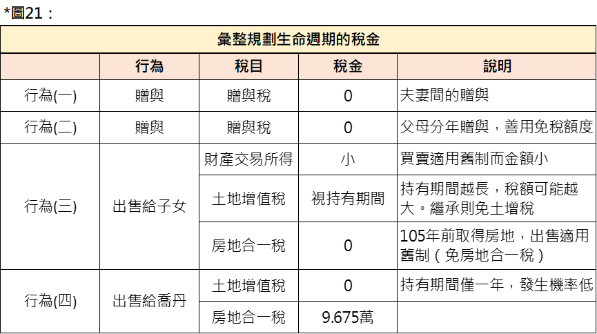 - 表列彙整前述行為(一)~(四)的稅金(圖21)