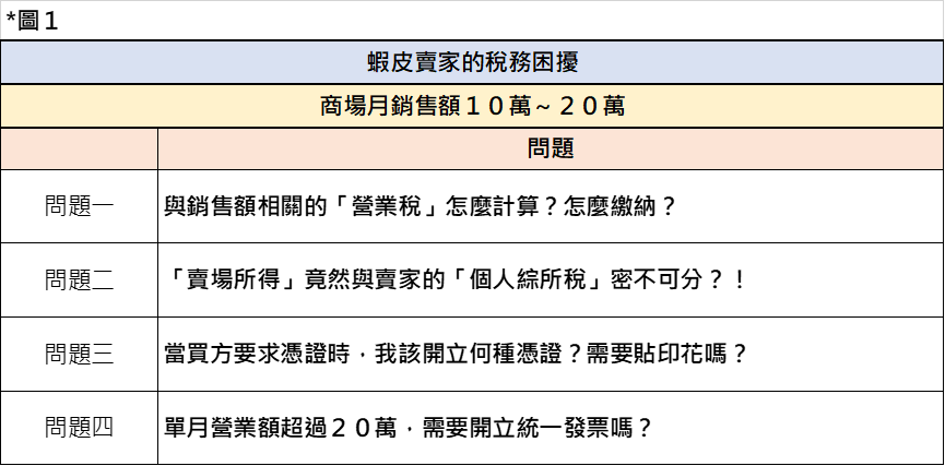 由於前述兩款稅目,係跟隨商場「月銷售規模」的差異,而有不同的計算與申報方式,可區分三級:(第一級)10萬元以下、(第二級)10~20萬元、(第三級)20萬元以上。本文重點放在第二級,即蝦皮賣家的商場月銷售額介於10萬~20萬元間。誠真事務所列示常見的實務問題(下圖1),引領讀者完整的了解「營業稅及營所稅」在網路銷售事業的運作。